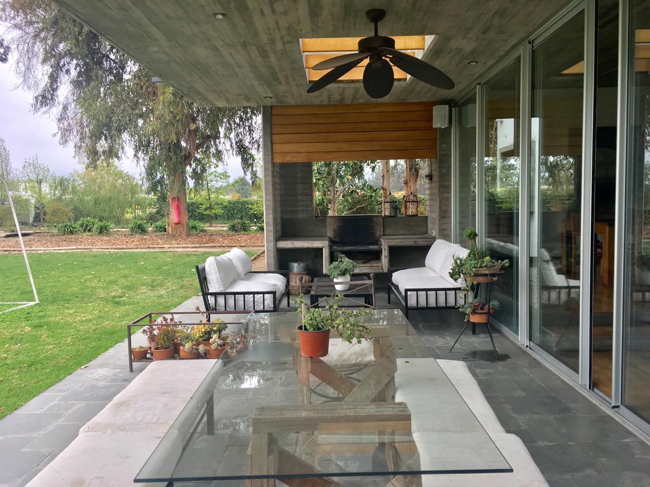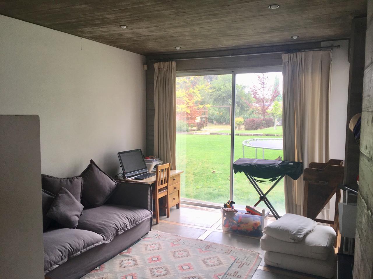 Hall de distribución con piso de piedra pizarra que da a un amplio living comedor, con piso de madera, separados por un muro de media altura con una bosca que le da mayor calidez al living, que salen a una gran terraza techada con tragaluces que permiten que pase la luz natural hacia la terraza y el living comedor con parrilla en obra. Baño de visita, sala de estar con salida al jardin, 2 dormitorios que comparten un baño y dormitorio principal en suite.