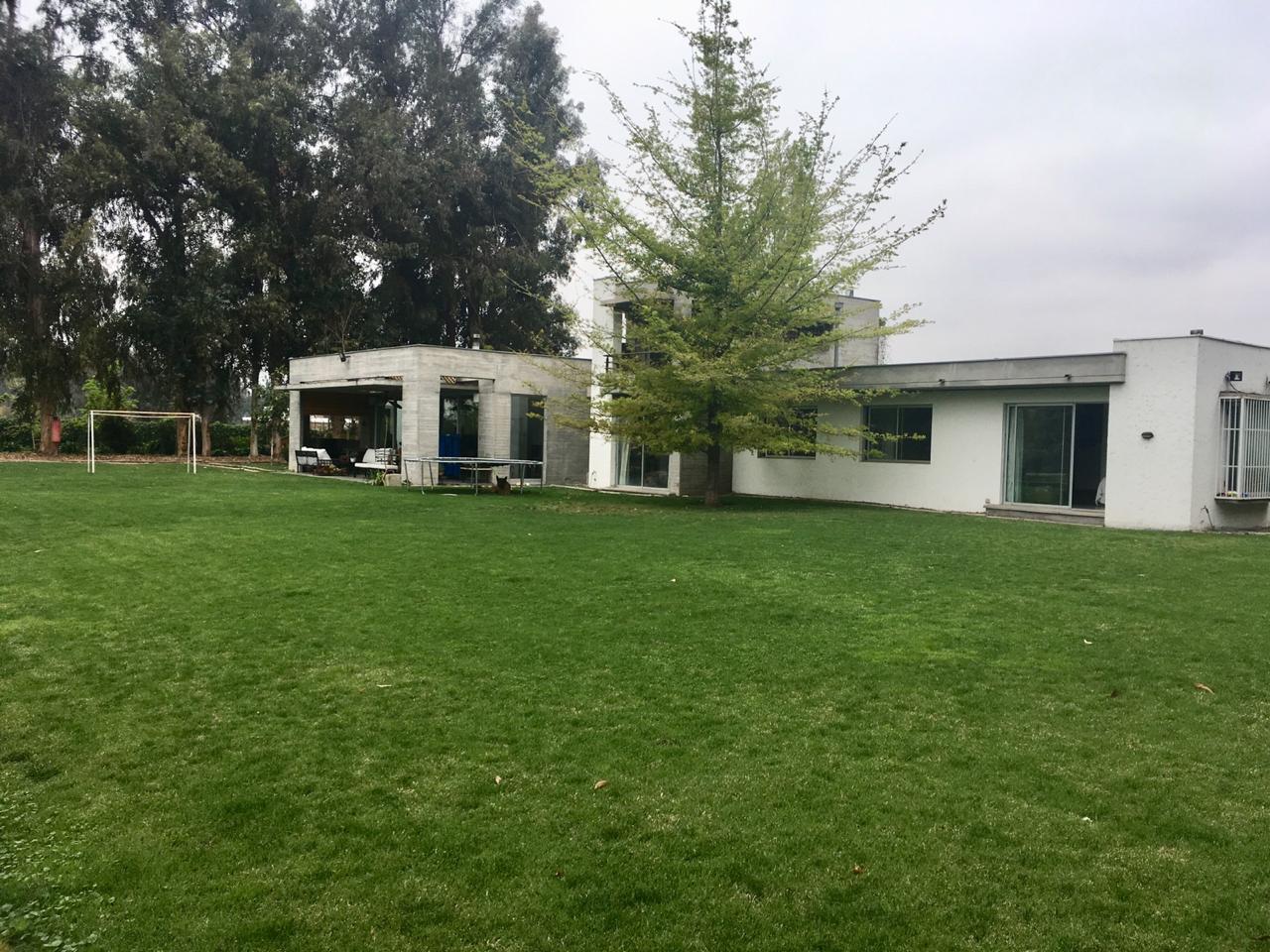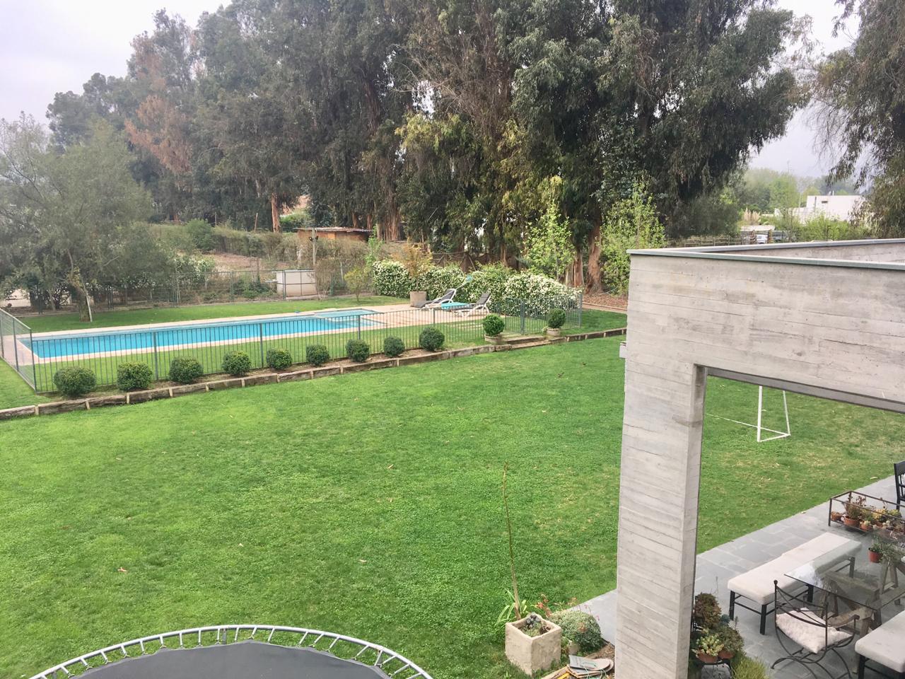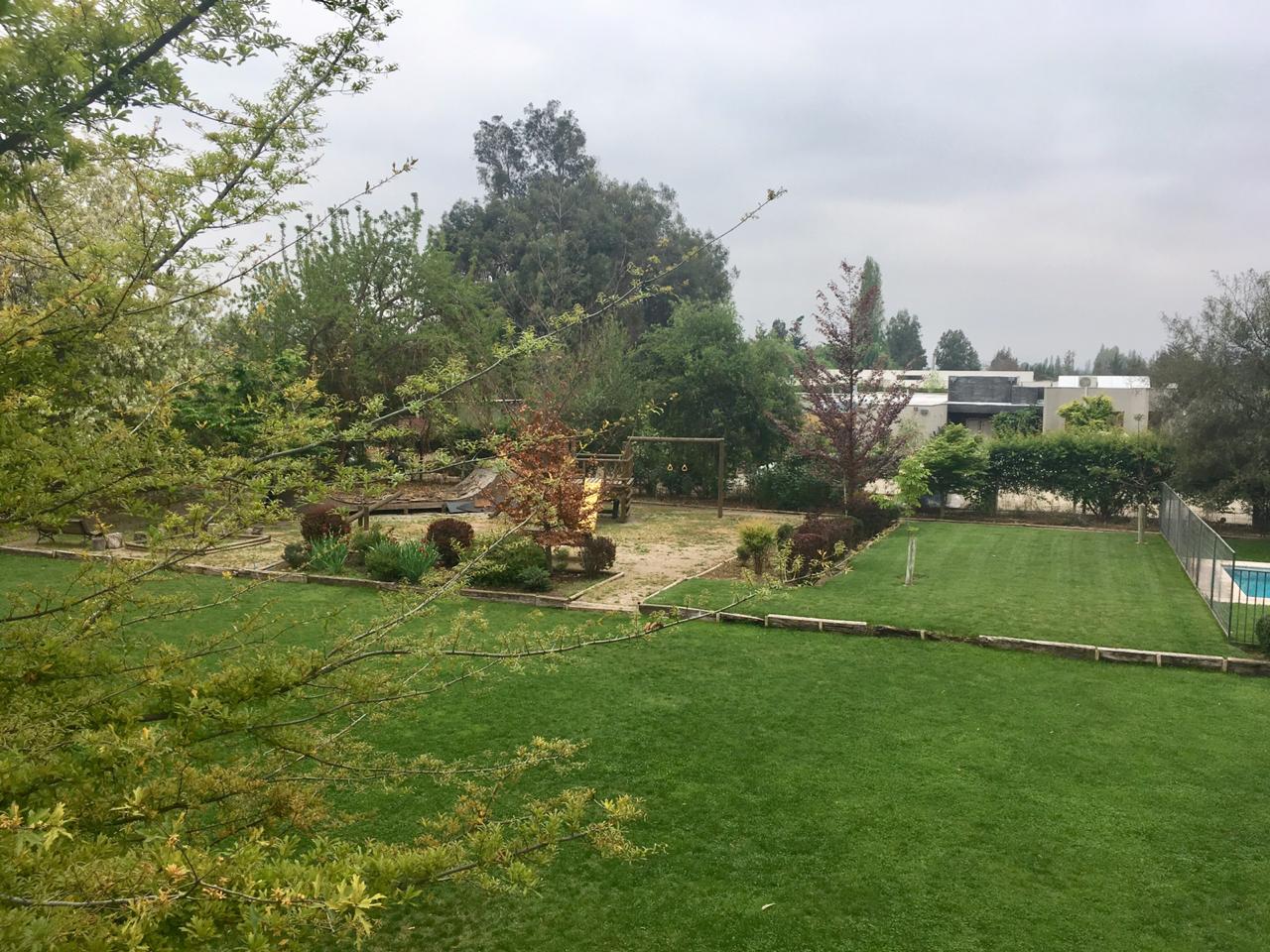 Jardin formado con grandes árboles, sector de juegos, piscina con reja, agua de pozo.