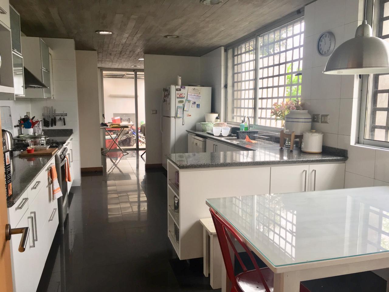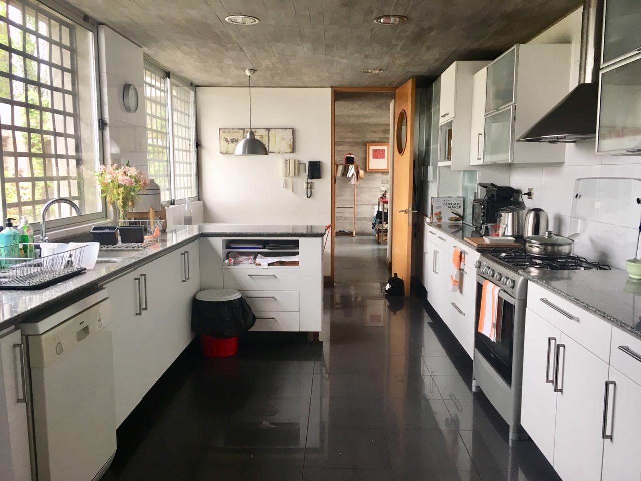 Amplia cocina con comedor de diario, cubiertas de granito, dormitorio y baño de servicio, patio de servicio techado con closets.